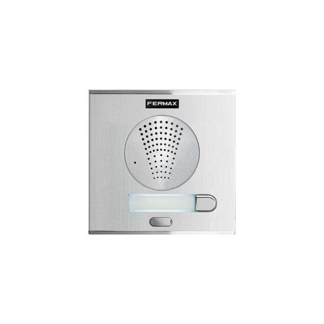 zamak inyectado con acabado cromado, en línea con el perfil curvo del panel. Impermeable para exteriores. Equipado con contactos especiales chapados en oro para mayor durabilidad. La pulsación del botón de llamada se confirma mediante una señal acústica del amplificador. Los pulsadores incluyen un tarjetero de policarbonato (acceso frontal), para alojar una etiqueta con el nombre del propietario y el número de puerta. La iluminación integrada permite ver a los titulares de tarjetas incluso en completa oscuridad. Sistema : DUOX PLUS (digital 2 hilos)